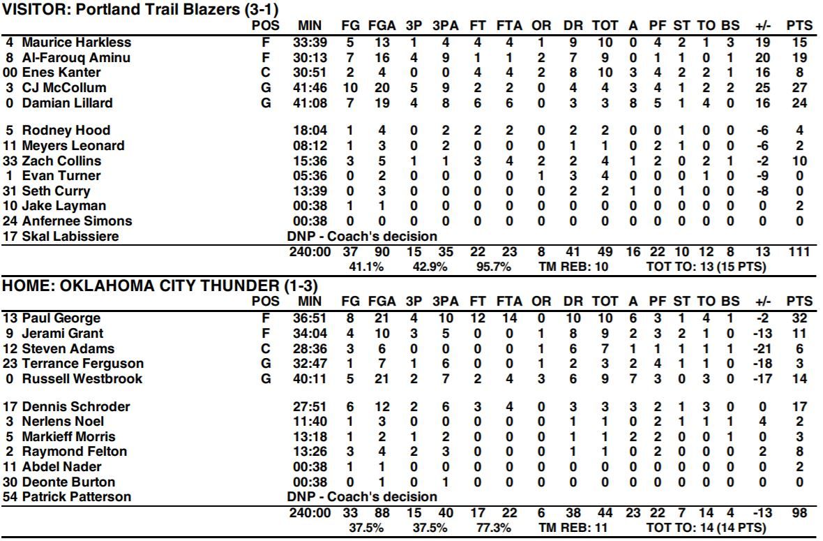 The Portland Trail Blazers took a commanding 3-1 series lead on Sunday night in Oklahoma City, beating the Thunder by a final score of 111-98 at Chesapeake Energy Arena. In what felt reminiscent to Game 2 in Portland, the Thunder were unable to close the second quarter on a high note, instead allowing Portland to regain the lead before the break. The Thunder struggled in the third quarter, with Portland pushing their advantage to 19 and never looking back. CJ McCollum and Damian Lillard led the way for Portland with 27 and 24 points, with Paul George the high-man for OKC with 32 points, albeit on an inefficient 8-of-21 from the floor. Russell Westbrook shot just 5-of-21 in the loss, drawing some groans out of the home crowd as he finished with 14 points.
