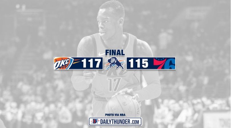Though Oklahoma City led by as many as 16 and held an 11-point advantage with less than 10 minutes remaining, the Sixers scored 36 points on 68.8 percent shooting in the fourth — taking a 115-113 lead when Jimmy Butler stole an errant pass by Dennis Schroder and converted it into a layup with 6.9 seconds to go. However, with Russell Westbrook on the bench having fouled out, George hit the dagger three while getting fouled by Butler. He converted the free throw to put OKC up two with 5.1 seconds to play. The Thunder defense then came up with a stop and escaped Philly with the win.