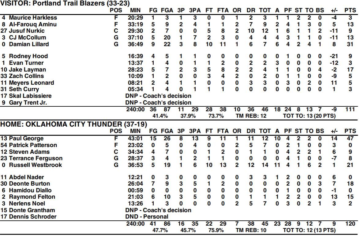 The Oklahoma City Thunder (37-19) defeated the Portland Trail Blazers (33-23) by a final score of 120-111 on Monday night at Chesapeake Energy Arena. The win was Oklahoma City’s fourth in a row and 11th out of the last 12. Paul George and Russell Westbrook shared the historic spotlight in the win, with Westbrook achieving his NBA-record tenth straight triple-double and George recording a 47-point triple-double of his own. The Thunder victory clinched the season series against the Blazers, as OKC holds a 3-0 edge over their division rival in 2018-19.