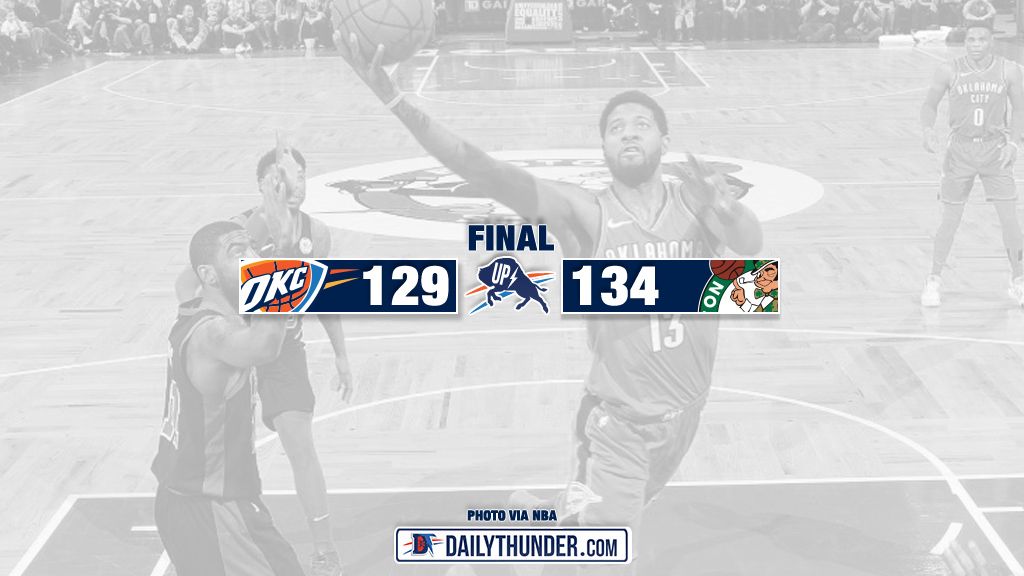 The Oklahoma City Thunder’s (33-19) seven-game winning streak came to an end on Sunday afternoon in Boston, as Kyrie Irving scored 30 points and dished out 11 assists to lead the Celtics (34-19) to the 134-129 victory. Paul George led all scorers with 37 points on 11-of-27 shooting, and Russell Westbrook posted 22 points, 12 rebounds, and 16 assists for his 19th triple-double the season. However, Boston hit a season-high 59.3 percent of their shots and forced a critical Westbrook turnover with 8.1 seconds remaining to end a frantic Thunder comeback attempt.