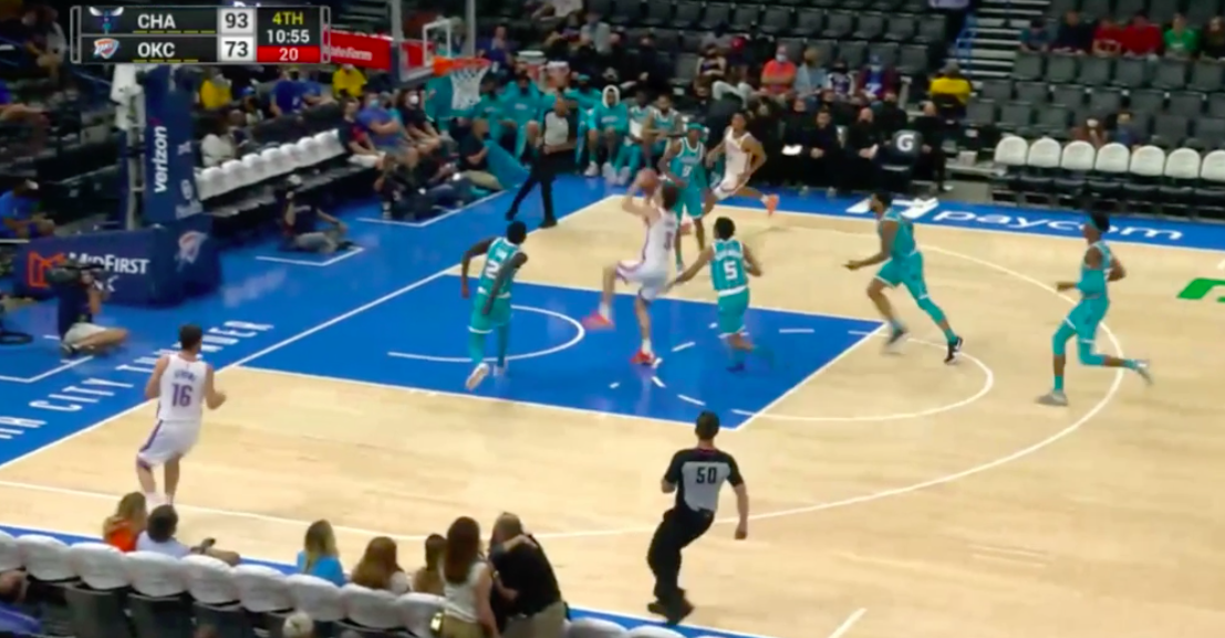 Here he uses the screen from Isaiah Roby and throws the one-handed, left-handed bullet pass to a wide-open Theo Maledon who is unable to convert. Luckily, he gets the offensive rebound and puts it in for an And-One.