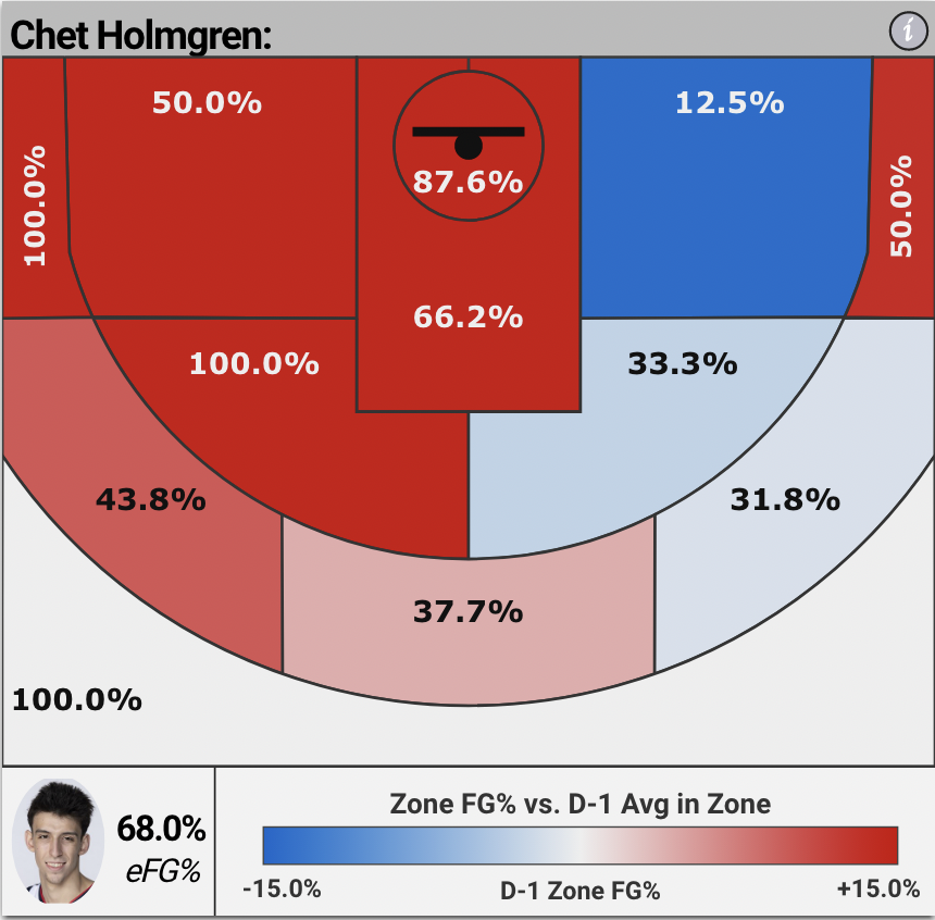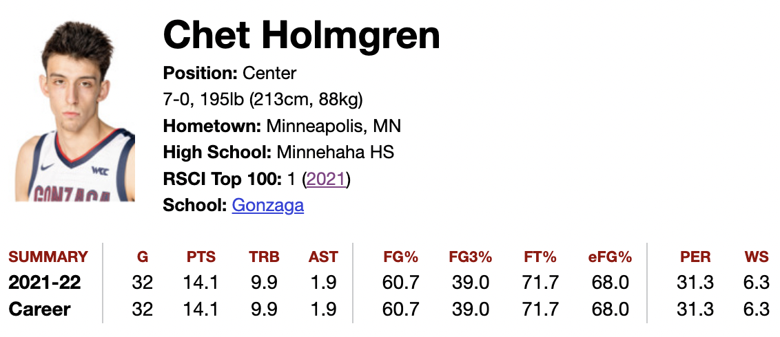 Chet Holmgren (2021) and Chris Boucher (2016) share the honor. This is not a direct comparison (Chet was younger, taller, more efficient, a better finisher, a better defender, and a better passer in college) but it shows that this is Holmgren brings a highly unique skill set to the table. The combination of dominant rim protection and competent floor spacing is not something you can get out of the top three in almost any draft. The Thunder would be well on their way to playoff contention in the near future if Chet fell to them. Let’s take a look at why.