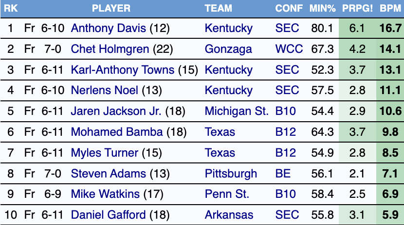 My personal number one prospect in this class, in his own tier, is Chet Holmgren. Coming out of Minnehaha Academy in Minnesota with Jalen Suggs, Chet joined Gonzaga as a true freshman and all he did was finish second in the nation in BPM. Chet is a unique talent (at least, for one more year until Victor Wembanyama and maybe Kel’el Ware arrive) in that he is a tall, offensively versatile, lanky seven-footer who–despite being listed at under 200 pounds–absolutely dominated the college game. The Thunder have the second overall pick, and I would consider them lucky if Orlando passed up on Holmgren. If so, I believe GM Sam Presti would sprint the card up and wouldn’t think twice about who he is picking. We know how much he loves length and tools, and Chet is exactly what he is looking for. Only two players since 2008 in college basketball have accomplished this: