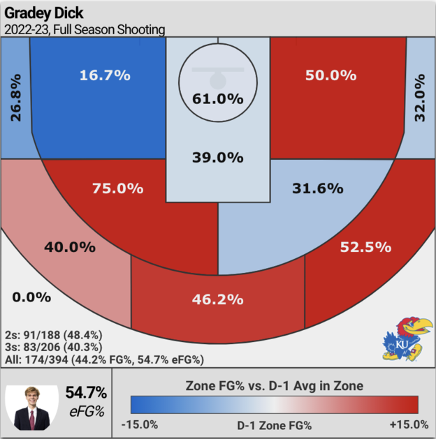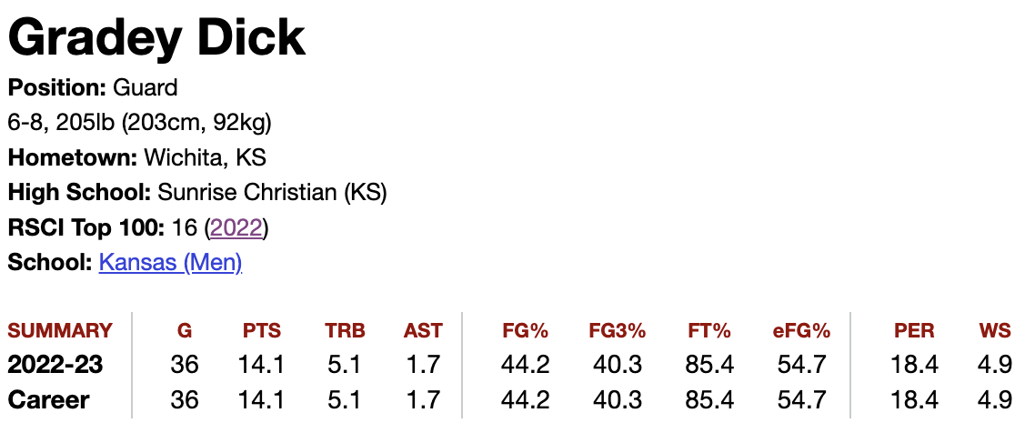 The obvious NBA skill that jumps off the page from Gradey is his perimeter shooting. He was one of the best shooters in high school basketball for the last couple of years at Sunrise Christian and his success continued at Kansas in his lone season there. As a freshman for the Jayhawks, he averaged 14.1 points per game on 58% TS and 40% from three on 5.7 attempts per game. He also shot 85% from the free throw line, showing tremendous natural touch and hand-eye coordination.