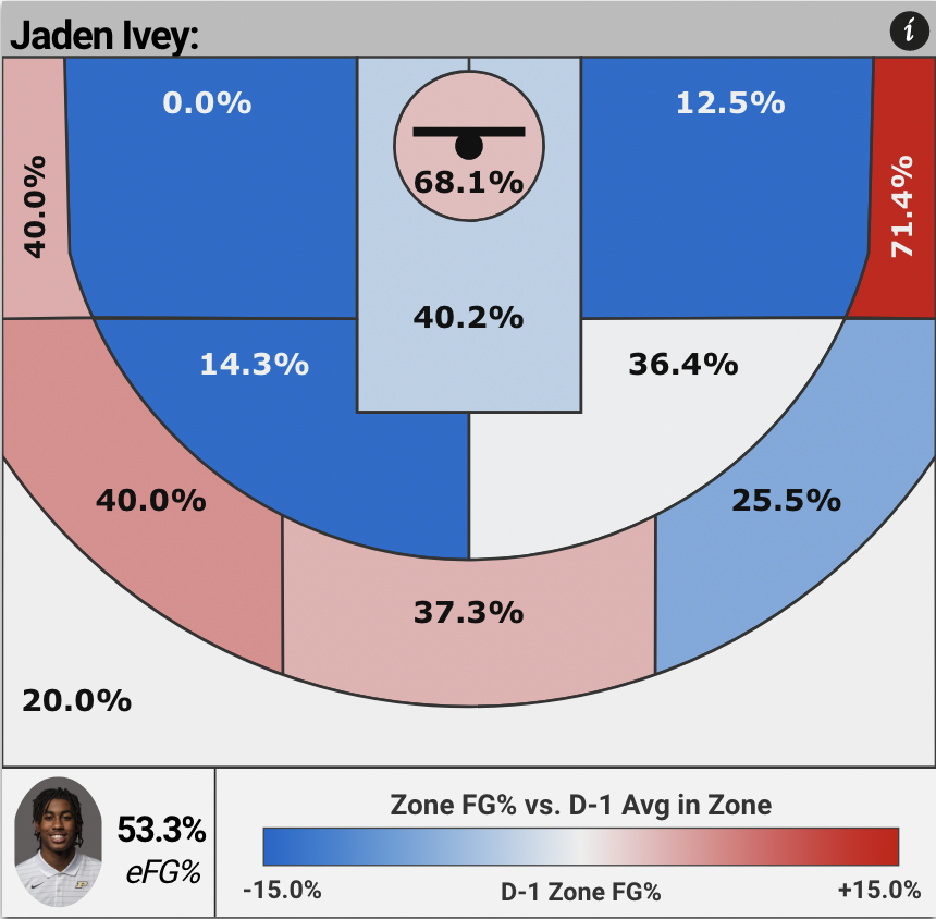 This past year at Purdue, Ivey shot 35.8% from three and a solid 74.4% from the line. He was only assisted on 60.9% of his threes, the lowest of the top four guys in this draft class. He showcased a variety of shots in his arsenal, including movement threes, catch-and-shoot, self-creation, and pull-up jumpers. I fully believe in his shot long term, although his semi-low release point is a bit worrisome at the next level. He starts low and brings it up to his chest and in front of his face, but these issues are why your coaches and player development staff get paid. The present shooting indicators and his touch on runners and floaters in the paint give me a reason to believe the shot will be nothing to worry about at the next level: