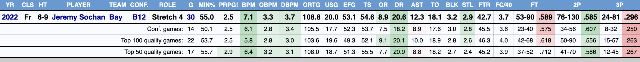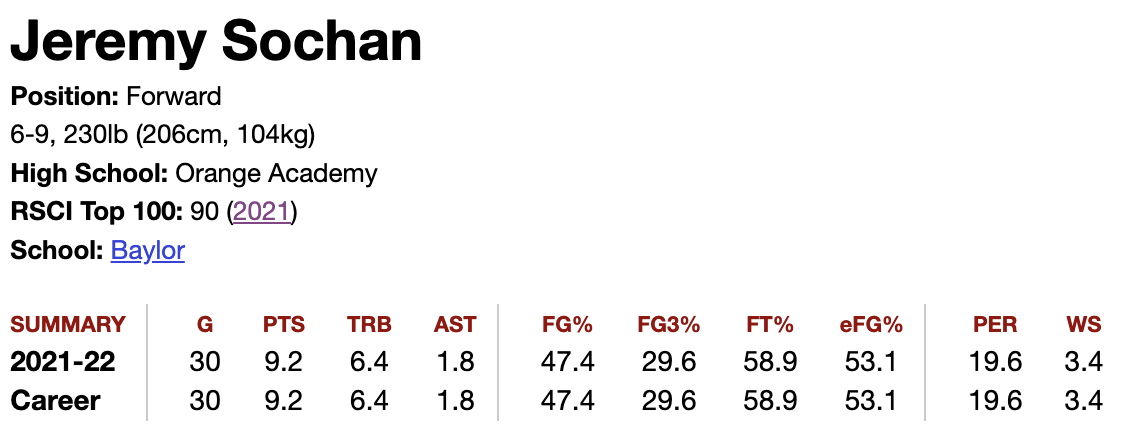 The numbers don’t look all that much better for Sochan a year later at Baylor: