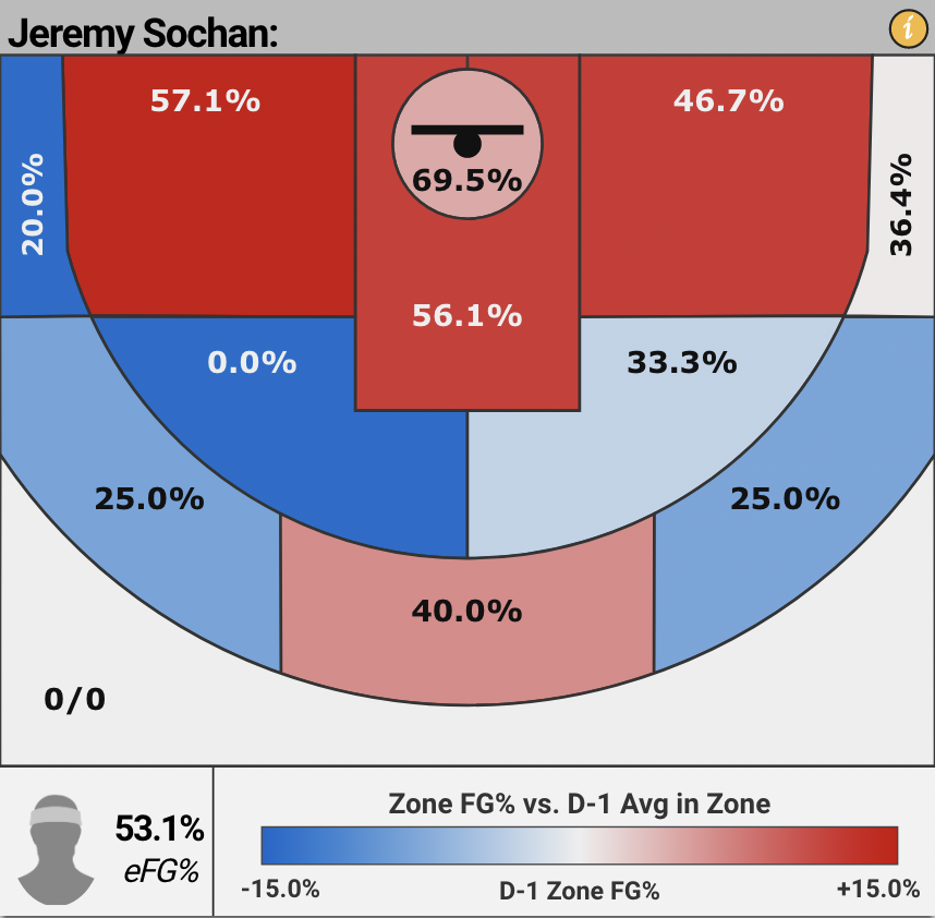 There are many avenues for Sochan to achieve offensive value. He can leverage his high level finishing at the basket and around the paint, develop a very capable C&S three point jump shot, or improve the handle some in order to attack his opposing defenders. At the end of the day, if he is a complete nonfactor from behind the arc, a lot of his offensive value in his passing and finishing is zapped.