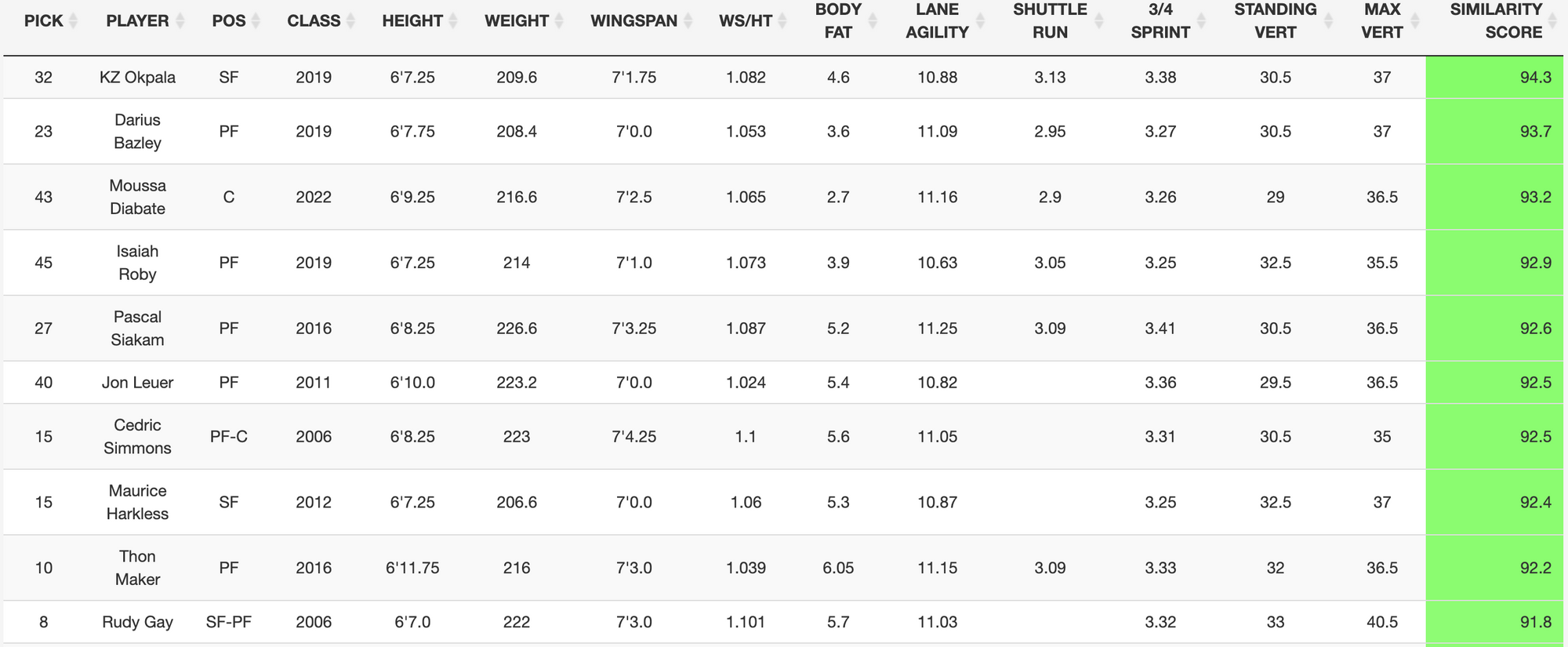 Miller is a big guy, coming into the combine at 6'9.25 without shoes and 213 pounds. His 7'2 wingspan is good for his size and he should be a versatile big at the next level. I can imagine based on this list below of some close comparisons physically, Thunder fans would immediately point to foreboding Darius Bazley comp. That comparison falls short to me, as Miller is not only bigger and lengthier but, unlike Bazley, he has some basketball skills to go along with his movement ability. Bazley got his shot blocked almost as often as any big in recent history, and Miller possesses much better natural touch and the ability to embrace and play through contact.
