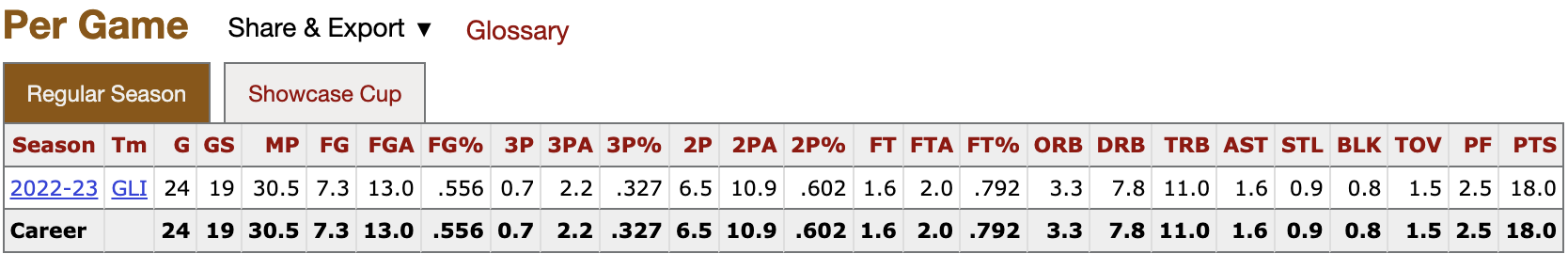 Miller joined forces with fellow draft-eligible players Scoot Henderson, Sidy Cissoko, Efe Abogidi and Mojave King on the Ignite. The move to the G-League was a prudent one, with Miller putting up stellar numbers against good competition for a draft prospect. For the year, Miller averaged 18 points, 11 rebounds, 1.6 assists, and 1.7 stocks on 64% TS in 24 regular season games. However, his numbers got even better after the G-Leauge All-Star break (albeit this is only 11 of the 24 games in the regular season) where he put up 20.7 points, 12.9 rebounds, 2.3 assists, and 2.2 stocks on 66% TS.