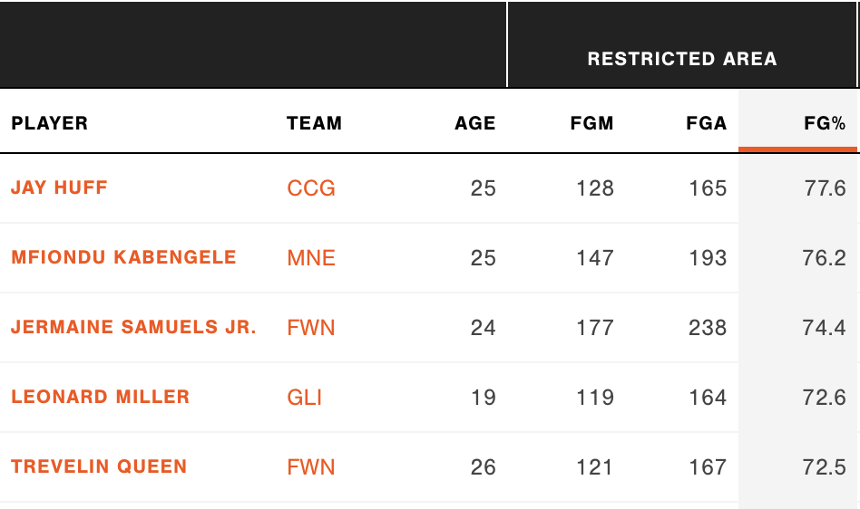 Here are the top five players for finishing in the restricted area in the G-League last season per NBA.com, with Miller being the youngest of the group by far. I believe he's still learning how to be 6'11 after his sudden growth spurt in high school, making the potential for more rim running and play in the paint intriguing for whoever drafts him.