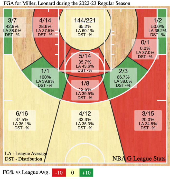 Despite Leonard's mediocre percentages from behind the arc, he has some of the best natural touch in the class. Leonard Miller shot 73.5 percent on 280 attempts in the restricted area as a 19-year-old in the G-League across the regular season and the G-League Showcase, with 63% of those makes being assisted baskets.