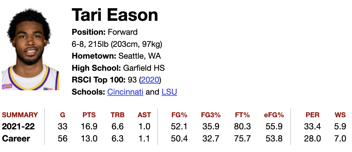 Tari Eason really came into his own this season at LSU following his transfer from Cincinnati. He was named First-Team All-SEC while–funny enough–winning the SEC Sixth Man of the Year as well. As quite easily LSU’s best player, it was odd to see him coming off the bench so often, but it could have something to do with him being a bit foul-prone at times. Alas, Eason was a fast riser throughout the season and was on breakout watch prior to it, and has solidified himself as a first-rounder in this class. Before diving into specific attributes of his game, I stumbled upon this query while writing this piece.