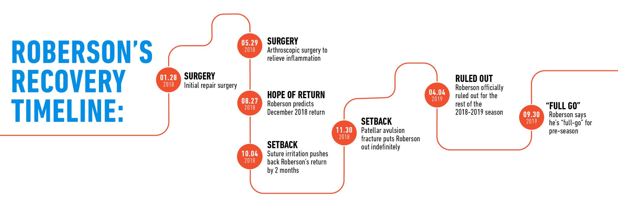 Roberson had his initial repair surgery for a patellar tendon rupture on January 28th, 2018, and was fully expected to return for the 2018-2019 season. Unfortunately, Roberson ended up needing two more arthroscopic procedures to relieve inflammation (May 29th, 2018) and resolve a suture irritation (October 4th, 2018), respectively. Roberson’s biggest setback, however, occurred in November 2018 when he suffered a patellar avulsion fracture while going up for a layup during practice. From that point forward, Roberson’s recovery was filled with ups and downs and promises of a return that never came to fruition. He declared himself a “full go” at media day in 2019, but remained absent from Thunder games (and practices) before deciding to rehab on his own in Los Angeles. All hope of a Roberson return seemed lost, until one fated day when Rudy Gobert’s positive COVID-19 test changed the course of the entire 2019-2020 NBA season.