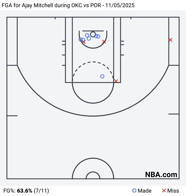 - Ajay Mitchell was also not intimidated, a more recent development from the second-year standout. Mitchell was looking off kickouts in favor of getting to the cup, where he converted 6 of 8 attempts. That's a higher volume and efficiency than Shai, Victor Wembanyama, and Tyrese Maxey have averaged this season.