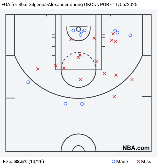 - Shai was not intimidated by the mighty Donovan Clingan, which is no surprise. But he had an off night shooting, missing 7 of 10 shots between the arc and the paint, and all five shots he took from the free throw circle.