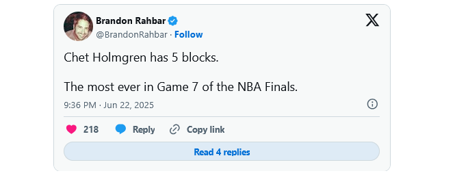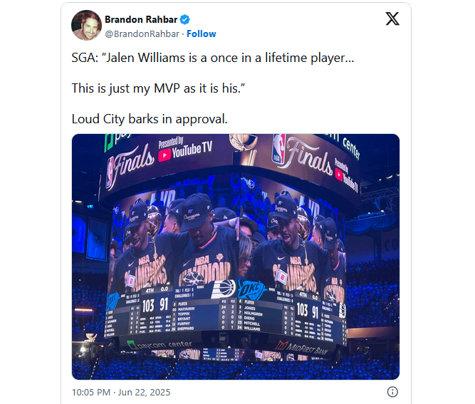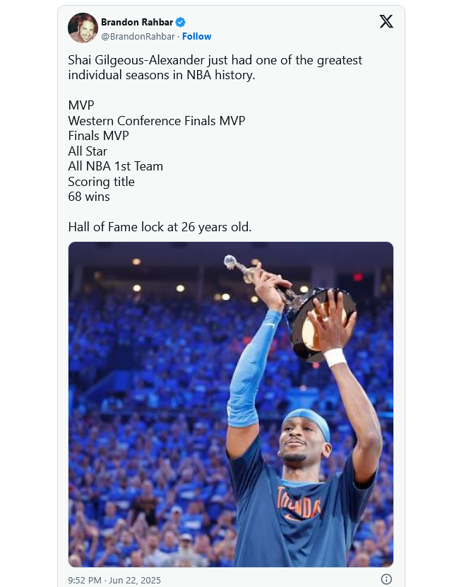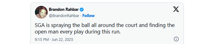 In addition to the MVP, Chet Holmgren (18 pts, 8 rbs, 5 blk) and Jalen Williams (20 pts, 4 rbs, 4 ast) finished their first title run as Shai's stars with solid, if offensively underwhelming performances. The Thunder overcame poor three-point shooting (11-40 team 3PA) once again, but were ultimately great enough this season to lean on Shai for points while the rest of the roster stifled their assignment with energy and force on defense. Tonight was no exception.