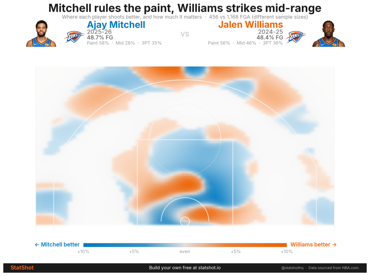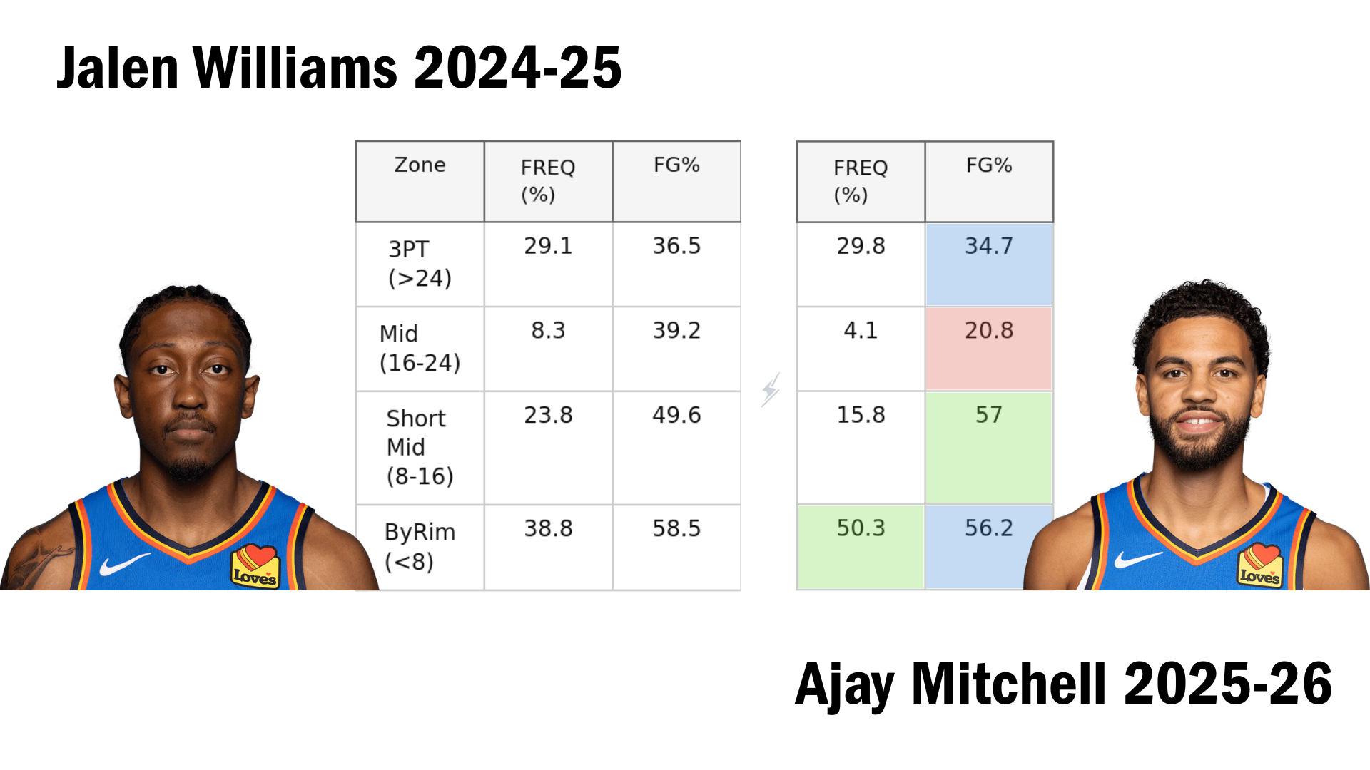 Ajay has essentially replicated Jalen Williams' shooting from last season--minus the middies. The one area Mitchell outshines the ghost of Williams is on the interior, where he is more tethered to the cup and less likely to settle for jumpers. His blend of speed and touch makes for a lefty finishing package rivaling that of the bigger, stronger Williams.