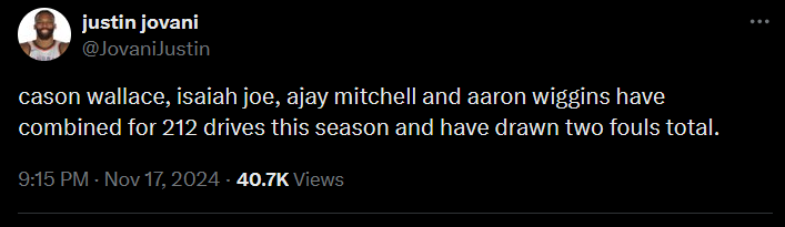 Elrod: The biggest culprit in the Thunder's ability to get to the free throw line are the players. Jalen Williams, Aaron Wiggins, Isaiah Joe and Cason Wallace were all poor foul-drawers fouls in college, so why are we expecting anything different in the NBA?