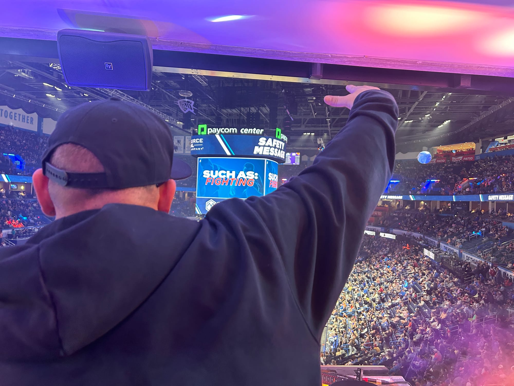 But just as any OKC player will deflect credit to their teammates, One is quick to point out that he is just one part of a talented and well-oiled Thunder production crew. He praised his fellow entertainment team including the Thunder Drummers, Thunder Girls, The O’City Crew, Rumble the Bison, Malcolm, Emily, Gabe, Mario, the concourse DJs, and Lite Brite, the official DJ for the OKC Blue and occasional cover when Marcus is called to a tribal conference in-season.
