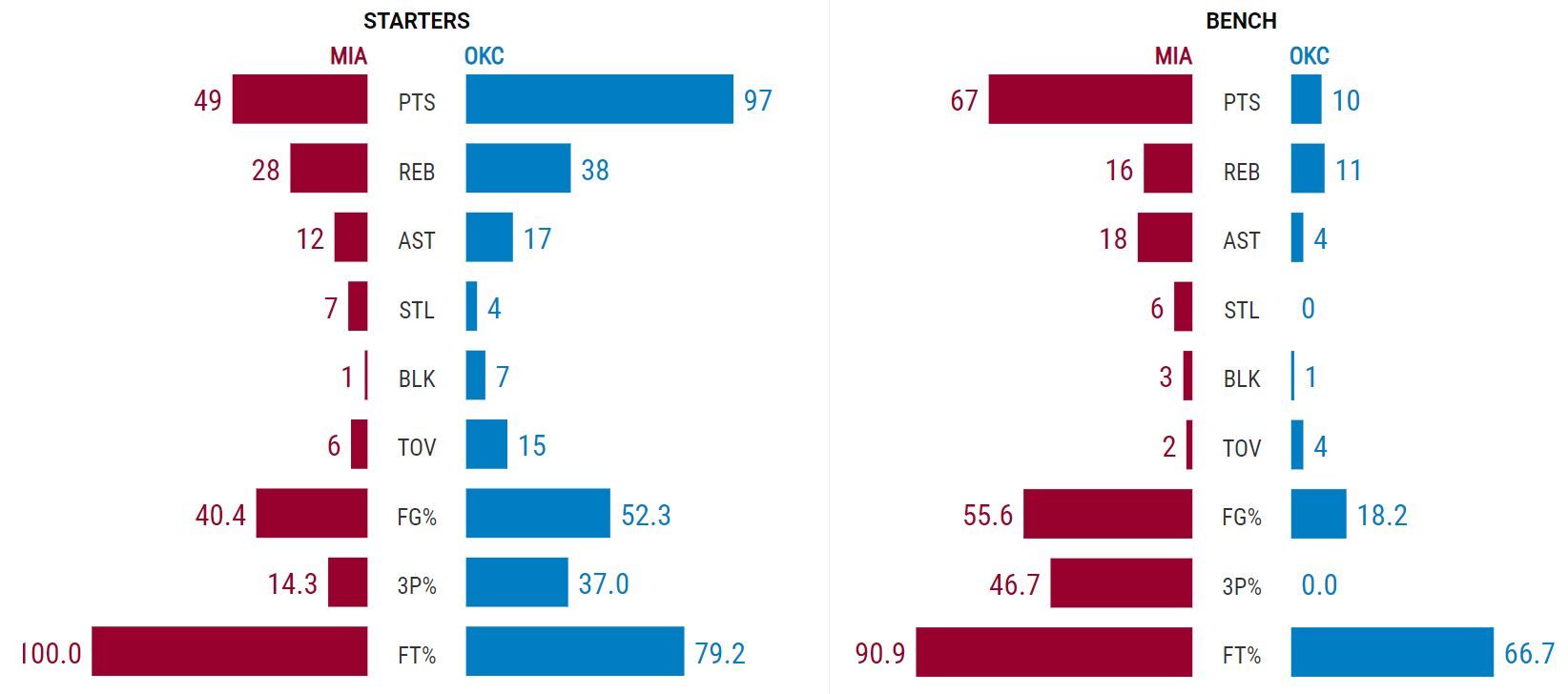 Paul George led the way for OKC with 31 points (9/18 FG, 4/11 3P), nine rebounds, five assists, two blocks, and two steals. He was joined in double-figures by Jerami Grant’s 27 (10/16 FG), Dennis Schroder’s 20 (7/16 FG), and Steven Adams with 10 points and 12 rebounds. The Thunder starters outscored Miami’s 97-49, but ultimately couldn’t overcome the bench’s poor play despite scratching to within six with a little less than two minutes remaining.