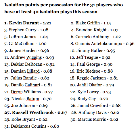 the league. There are still a lot of things Billy Donovan and the Oklahoma City Thunder are trying to work out — from the spacing Andre Roberson is on the court to the inconsistent bench play of Dion Waiters, Enes Kanter, Anthony Morrow and others — but they have the ultimate trump cards: Kevin Durant and Russell Westbrook. When those two are on the court together the Thunder outscore their opponents by 17.6 points per 100 possessions.”