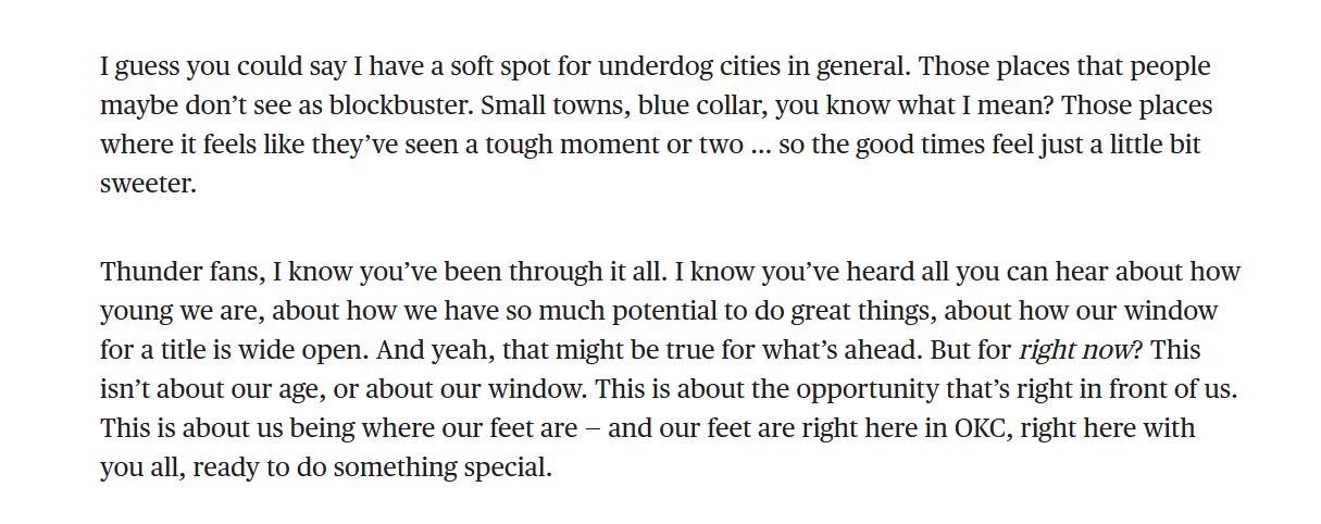 It's hard not to reminisce about the first Thunder Finals appearance back in 2012, when the first OKC youth movement appeared poised to return to the championship round for years to come. We know better than to assume things will play out as we expect, even though this version of the Thunder appears set up much better for the seasons ahead. Whether heartbreak, disappointment, or triumph lies ahead for OKC fans currently thrilled about the future, a title in the year 2025 is what we want most. Hopefully, as Lu Dort penned in a letter to said fans, "something special" is happening now, not later.
