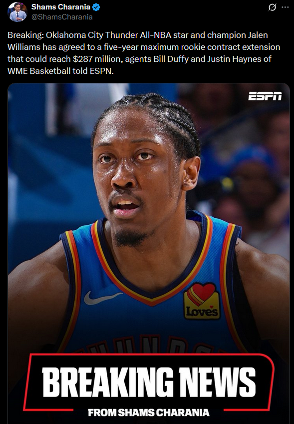 Another day, another quarter-billion dollar commitment in place. The Thunder's big three–Shai Gilgeous-Alexander, Chet Holmgren, and Jalen Williams–has now signed through the 2030/31 season after JDub's reported agreement: five years, $239 million starting at 25% of the cap, with Rose rule incentives to bump that up to $287 million starting at 30% of the cap. Williams has a realistic shot of triggering those incentives before the deal kicks in for the 2026/27 campaign.