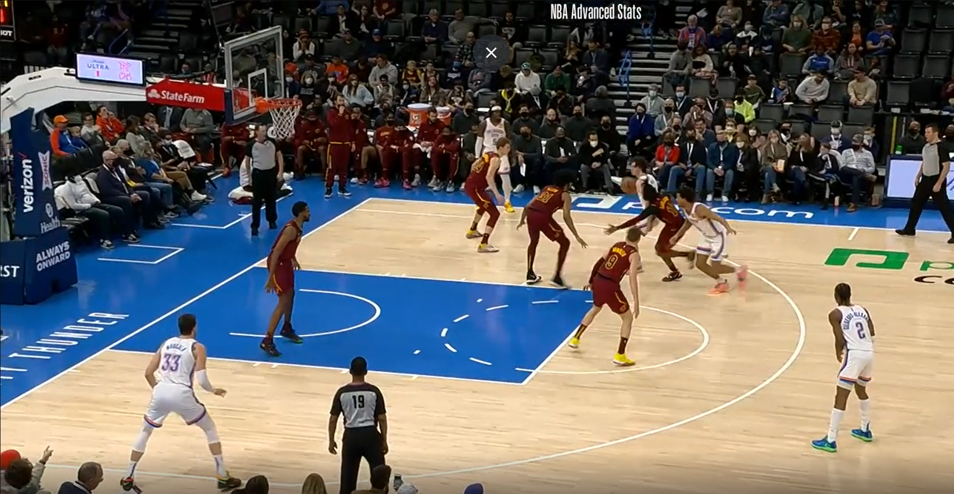 The pressure Giddey’s advanced passing puts on the defense is evident here. First off, Darius Garland goes over the screen and stays attached to the side of his body; Jarrett Allen is playing high up in order to trap him. Then you have Dylan Windler helping off Shai Gilgeous-Alexander, and down in the paint is Evan Mobley, playing all the way off a 43% three-point shooter in Mike Muscala just to help on the Giddey-led pick and roll. Give Giddey’s teammates space like this, and he’ll find them.