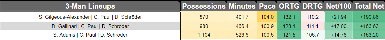 The Thunder’s three man lineup of Paul, Schröder, and Gilgeous-Alexander has been the best three man lineup in the entire NBA this season (minimum 200 minutes played) with a net rating of +28.6 per 100 possessions, per NBA.com.