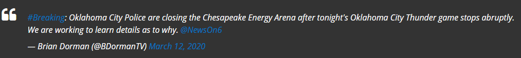 After some stalling by Thunder in-arena entertainment (the halftime show was even performed), the PA announcer broke the news that the game was postponed and told fans they were safe and could go home. Meanwhile, a since-deleted ominous tweet from Tulsa’s News On 6 began circulating, indicating that the police would be shutting down Chesapeake Energy Arena: