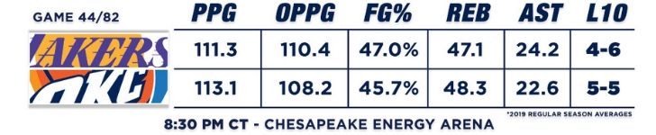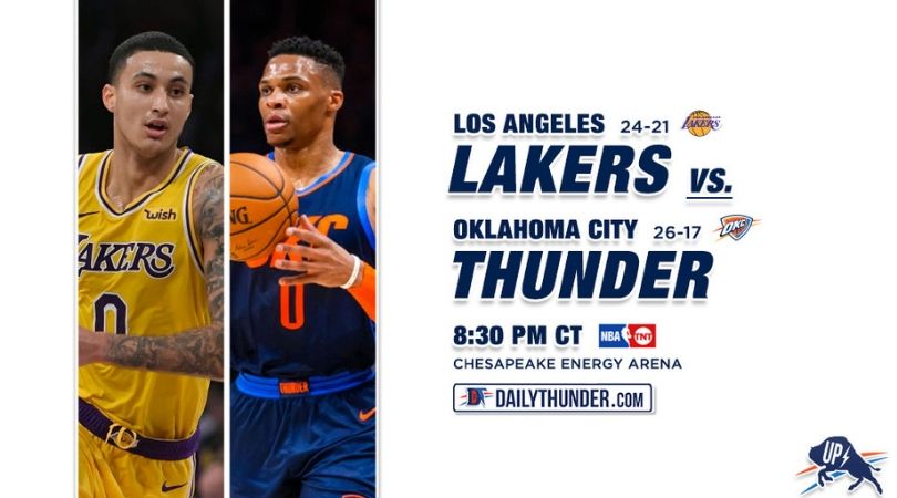The Oklahoma City Thunder (26-17) return to action tonight at Chesapeake Energy Arena, taking on the Los Angeles Lakers (24-21) in the second matchup between the teams this season. The Thunder beat the LeBron James-less Lakers by a final score of 107-100 on January 2, but have stumbled to a 2-4 record since then. Los Angeles has fallen to ninth in the Western Conference after going 4-7 in the 11 games without LeBron. Important game for both teams tonight in OKC.
