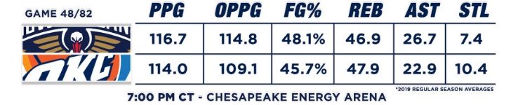 Replacing The Brow. Replacing Davis is impossible — yet somehow made even more difficult when other starters are missing. Jrue Holiday will likely be the unquestioned focal point of their attack, as he’s averaging 21 points and 8.1 assists per game this season. Julius Randle is another name to watch — he’s posting 19.9 points, 9.3 rebounds, and has scored 20+ in each of the meetings with OKC this season.