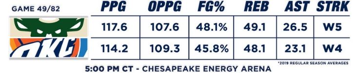 The Thunder’s (30-18) four-game winning streak will be put to the test tonight in Oklahoma City, as Giannis Antetokounmpo and the Milwaukee Bucks (35-12) will make their only appearance at Chesapeake Energy Arena this season. Led by their superstar MVP candidate, the Bucks are the number one team in the Eastern Conference and tied with Golden State for the most wins in the NBA. The game will feature two of the league’s top three defenses and another guy getting some MVP buzz — the Thunder’s Paul George.