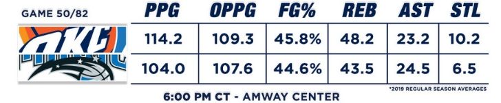 The Oklahoma City Thunder (31-18) are looking for their sixth straight win on the road tonight in Orlando, taking on the Magic (20-30) at the Amway Center. The Magic have lost six of seven and find themselves 11th in the Eastern Conference. The Thunder are fresh off perhaps their most impressive win of the season after beating the Milwaukee Bucks on Sunday night. OKC is holding steady at third in the West, leading the fourth-place Portland Trail Blazers by one game.