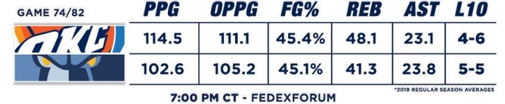 Flashbacks. The Thunder looked like their January/early-February selves on Friday night in Toronto, knocking down 20-of-43 (46.5%) from long range, forcing 21 turnovers, and riding a balanced scoring effort to beat the 51-22 Raptors. Westbrook struggled with his shot (6/20 FG), but his 13 assists were the most he’s had in a game since Feb. 7. If he can find his teammates for easy looks (and they actually knock them down), the Thunder should have no trouble tonight in Memphis. Jerami Grant (5/8 3P), Dennis Schroder (4/7 3P), and Terrance Ferguson (3/7 3P) made their point guard’s life much easier on Friday, so continued rhythm from those three would be a welcomed sign for the struggling OKC offense.