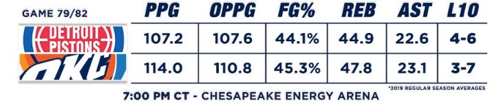 The Oklahoma City Thunder (45-33) are looking for their second straight win tonight at Chesapeake Energy Arena, taking on the Detroit Pistons (39-39) in the second-to-last home game of the regular season. The Thunder are currently seventh in the Western Conference — leading the 8-seed Spurs by a half game, and trailing the 6-seed Clippers by a game and a half. The Pistons are holding down sixth in the East, but need a win as they are only a game up on ninth with four games remaining.