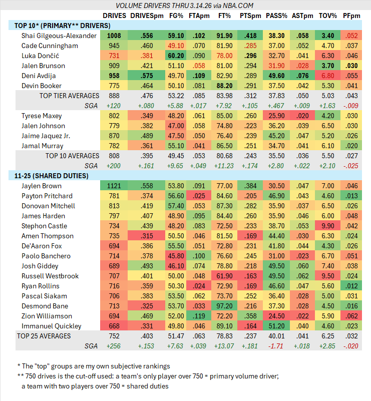 Only Shai, Cade Cunningham, and Jalen Brunson have been top-five in drives taken over the last two seasons. Only Shai and Brunson have been top-five over the last four. Shai has been top-two for five straight seasons. He's in a class of his own.