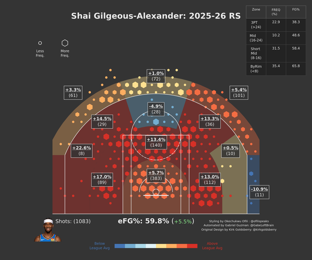 That's why Shai’s lethality in the midrange matters so much. A jumper is not the most ideal outcome for an SGA possession, but it’s the worst worst-case scenario defenses have had to live with in years. A clean release from Shai, anywhere, is now better than a 50/50 proposition. 54.4161525% to be exact, good for 1.088323049 points at a time.