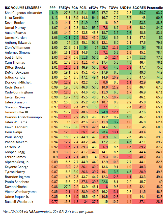 If you only counted Shai’s midrange attempts—no layups, no threes, no free throws—he would still rank third in isolation points per possession in the NBA, trailing only Luka and Booker.