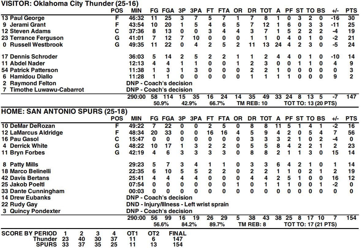 The Oklahoma City Thunder (25-16) dropped their third straight on Thursday night in San Antonio, falling to the Spurs (24-19) in double-overtime by a final score of 154-147. Despite Russell Westbrook’s 24 points, 24 assists, and 13 rebounds — and 119 points from the Thunder starting lineup — LaMarcus Aldridge exploded for a career-high 56 points and the Spurs hit 16-of-19 from long range to take the victory.