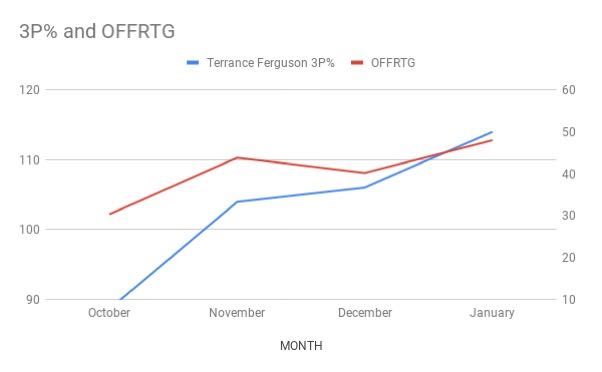 As for what this means for the Thunder offense, check out the offensive rating by month when charted next to Ferguson’s monthly 3-point percentage: