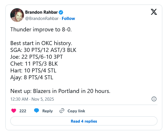 - The Thunder improved to 8-0, marking their best start to a season in franchise history.