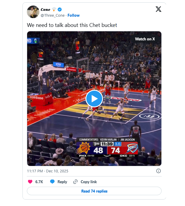 - Holmgren was monstrous again: 24 points on 9/13, 4/4 from three, 8 rebounds while roaming the paint again as OKC’s lone big (J-Will and Chet didn't share the court all game).