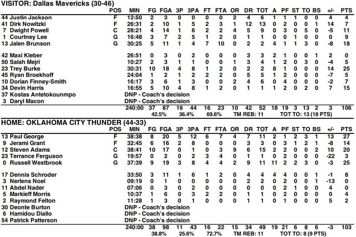 The Oklahoma City Thunder (44-33) dropped their second straight on Sunday afternoon at Chesapeake Energy Arena, losing to the Luka Doncic-less Dallas Mavericks (30-46) by a final score of 106-103. In what turned out to be an exciting back-and-forth finish, the Thunder were unable to get the necessary stops to secure the victory. Russell Westbrook recorded a triple-double with 25 points (9/19 FG, 3/8 3P, 4/4 FT), 11 rebounds, 11 assists, and two steals. Paul George was the high-man for OKC with 27 points, and Steven Adams dominated the Mavericks’ frontcourt with 20 points and 15 rebounds. However, Trey Burke led the Mavericks with 25 points off the bench, Jalen Brunson added 18 points, and Dallas knocked down 16 three-pointers to win the season series with OKC by a 3-1 tally.
