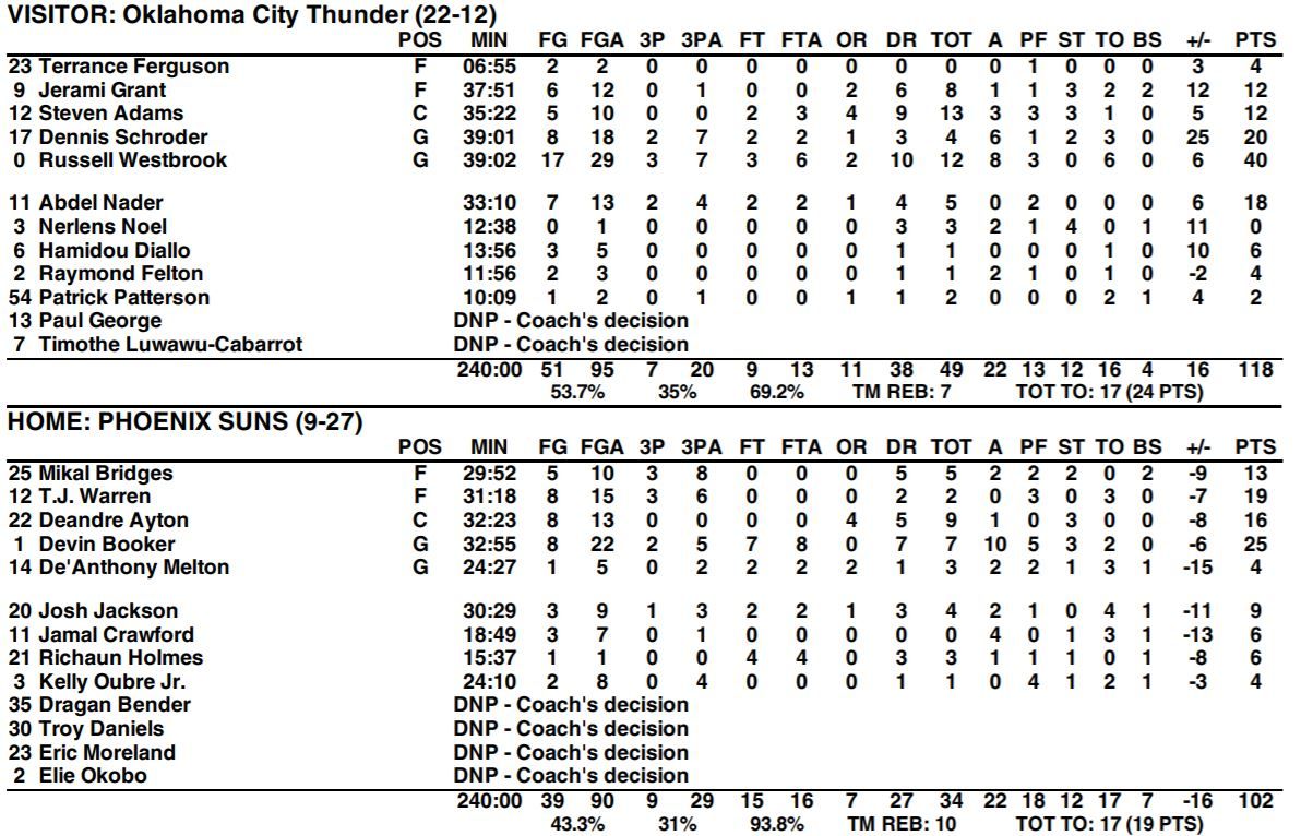 The Oklahoma City Thunder moved to 22-12 on Friday night in Phoenix, overcoming the absence of Paul George (quad contusion) to score a 118-102 victory over the Suns. Russell Westbrook led the way with a season-high 40 points, but it was Dennis Schroder who provided the juice when it mattered most.