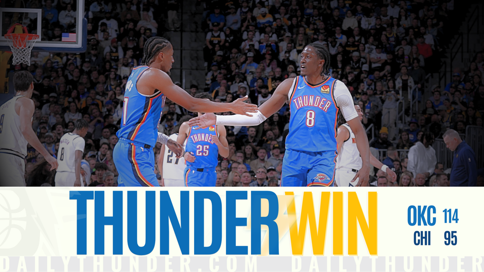 Oklahoma City (2-0) continued their season warmup, casually blowing out the Bulls (1-2) in Chicago. The game was competitive until an emphatic 22-3 run from OKC, from the 6:10 mark of the second quarter to close the first half, delivered several more highlights on the young, dominant season. The Thunder opened the second half up 59-39, and toyed with the Bulls the rest of the way to the 19-point win.