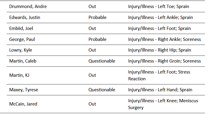 Alex Caruso is back! Philly is in worse shape: the Sixers are on the first night of the back-to-back and handling a lot of injuries delicately. Joel Embiid is out; Maxey and PG are iffy. Here's the carnage: