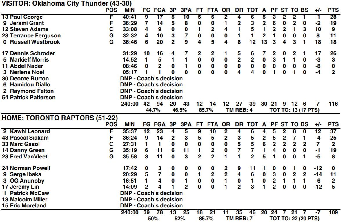 Throwback. You could be forgiven for thinking tonight was yet another instance of the Thunder falling flat — after all, a 13-point deficit in the third quarter will do that. However, OKC outscored Toronto 53-33 from the 5:23 mark of the third quarter on, getting valuable contributions from just about everywhere in the process. With George having more success against Kawhi, Schroder lighting it up off the bench, Westbrook triple-doubling, and threes falling at a ridiculous rate, the final 17 minutes looked more like the January Thunder than whatever we’ve been seeing lately. More importantly, Grant and Ferguson were crucial in the comeback and made some big shots when needed. The Thunder will need plenty more of that heading into the playoffs.