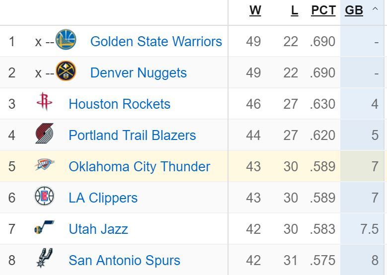 Holding Steady. With the win, the Thunder remain fifth in the Western Conference. Nine regular season games to go — the Grizzlies are next up on Monday in Memphis.