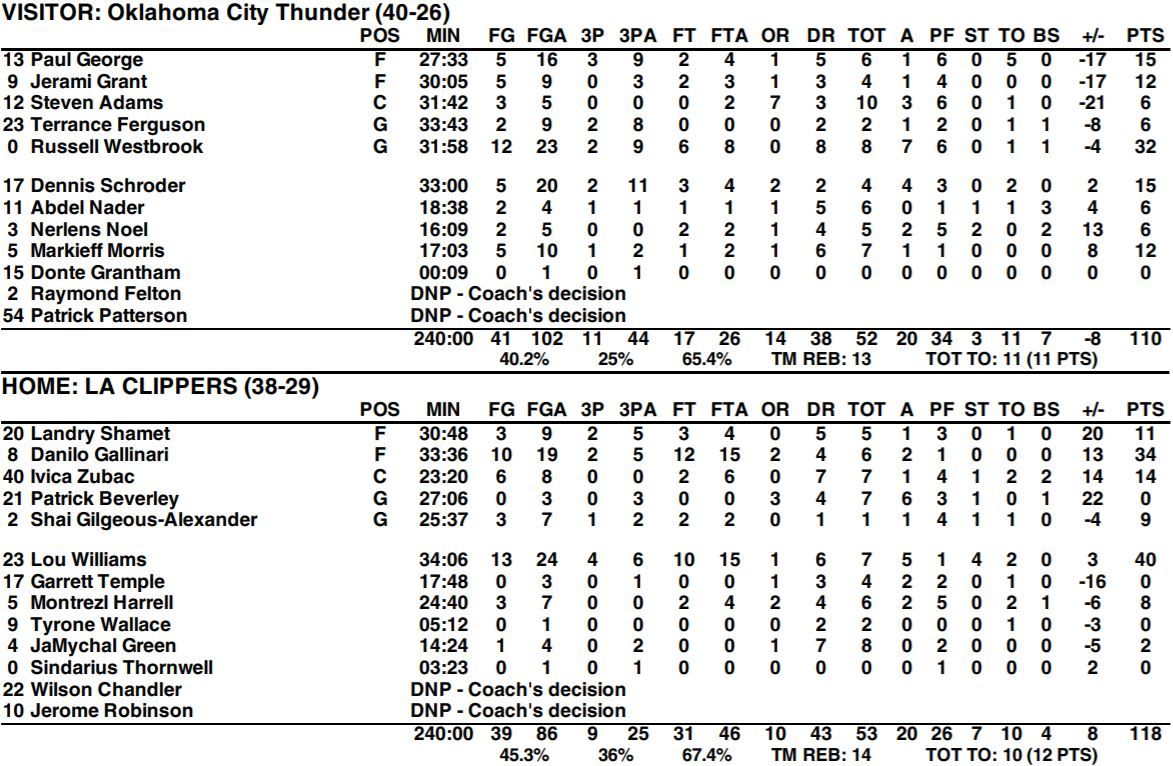 Kenny Mauer and the boys in stripes didn’t do any favors for the Oklahoma City Thunder (40-26) Friday night at the Staples Center, as OKC fell to the Los Angeles Clippers (38-29) by a final score of 118-110. Highlighted by a handful of questionable calls, the Thunder were unable to pull away with the game hanging in the balance during crunch time. Russell Westbrook and Paul George fouled out in final minutes after both were forced to sit during the third quarter with foul trouble. Westbrook led the way for the Thunder with 32 points, while Lou Williams and Danilo Gallinari combined for 74 points on a combined 23-of-43 shooting from the field, including a combined 6-of-11 from three. The loss was OKC’s seventh out of their last ten games.